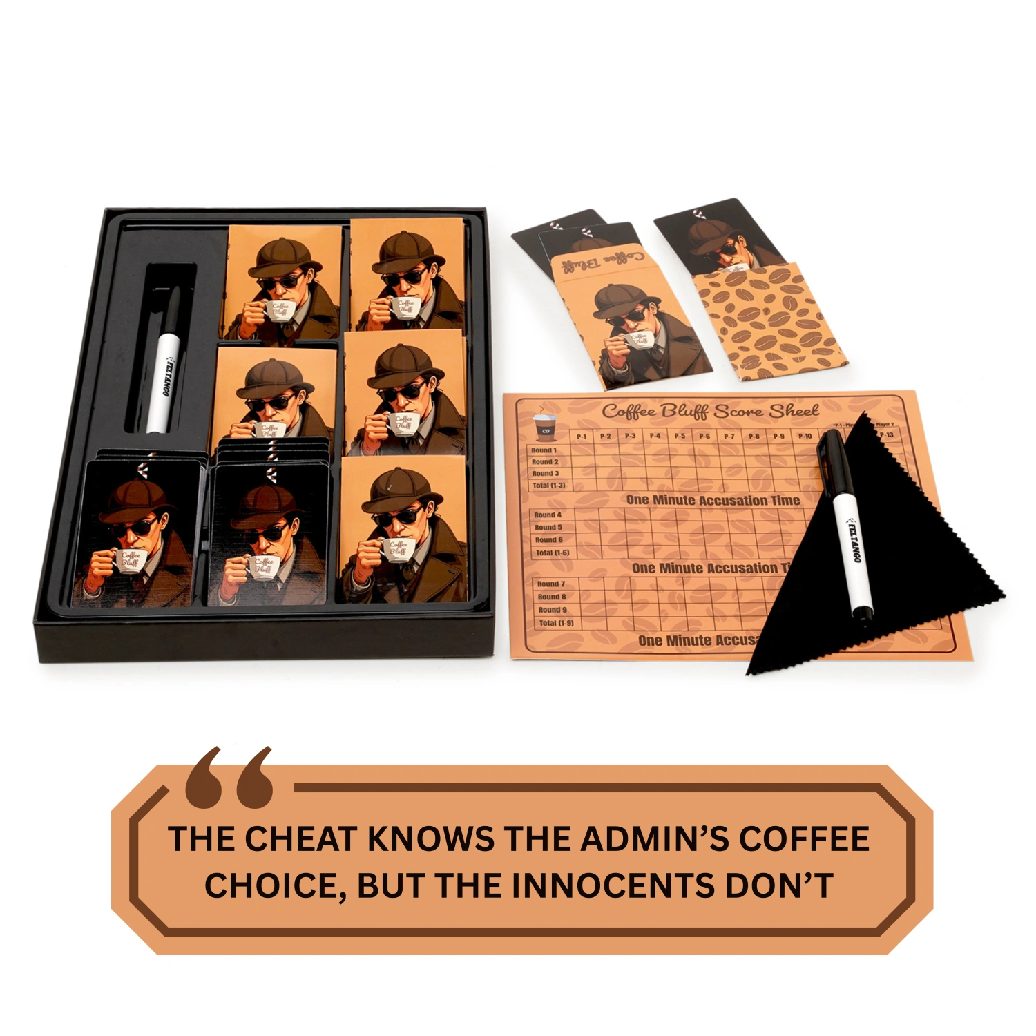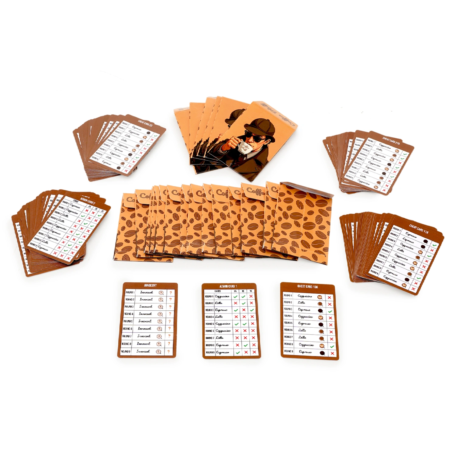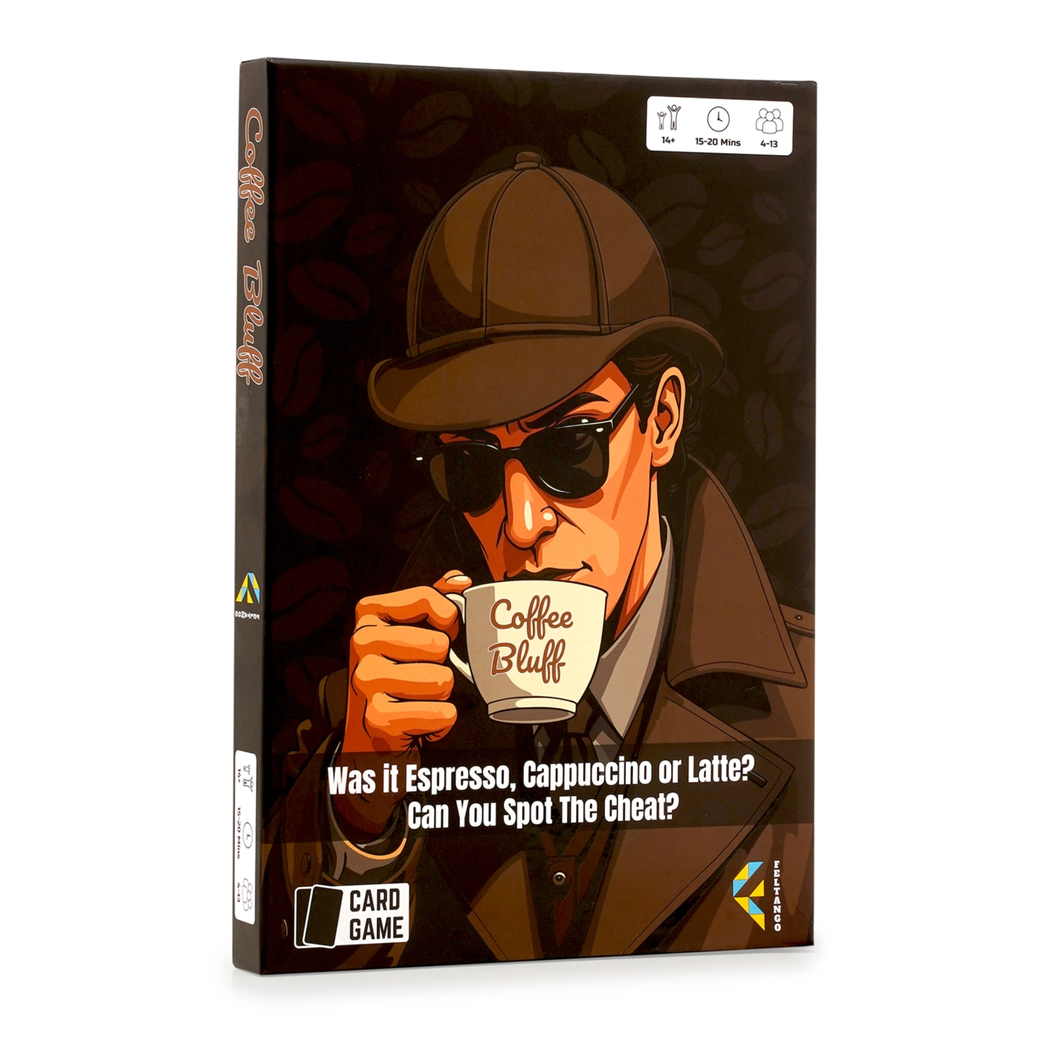 Can you spot the cheat, the deceiver, the imposter? Are you innocent or the bluffing mastermind? Play again and again, with each round more thrilling than the last. Grab yours today and uncover the Coffee Bluff! Is it Espresso, Cappuccino or Latte? Innocents can only Guess, but the Cheat knows it all! A quick-fire 15-minute bluffing game for super entertaining game nights!