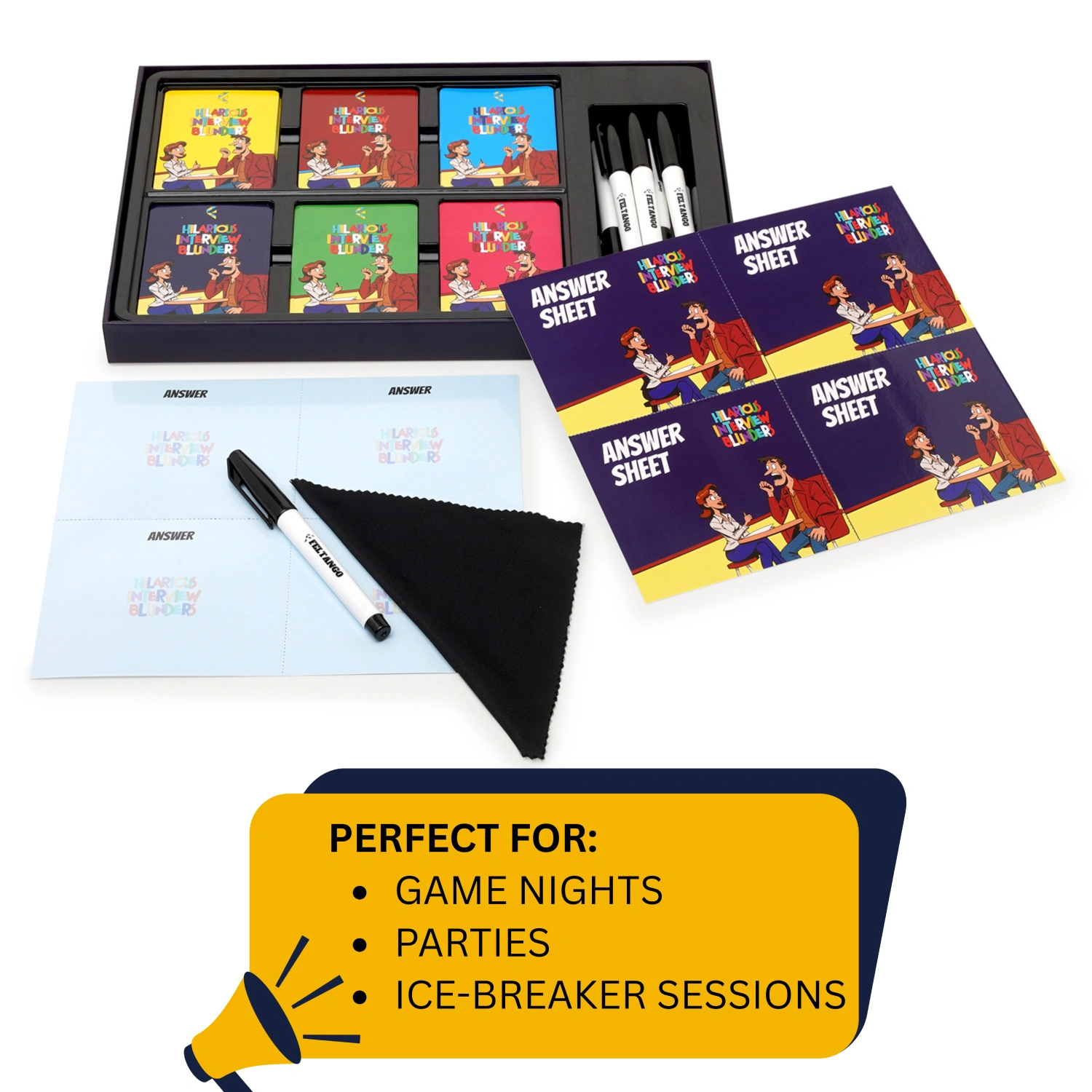 What’s inside? It has 6 different sets of Interview Question Cards with to maintain your interest levels, 8 Answer Pads and Erasable Markers.