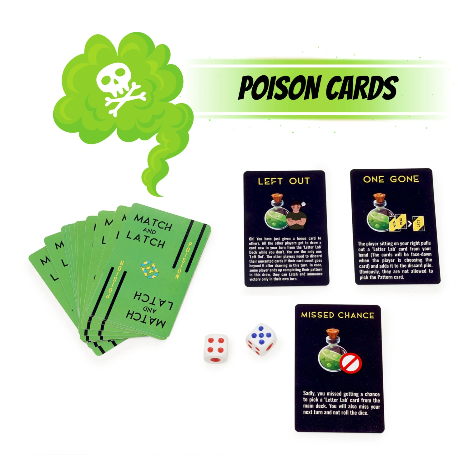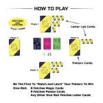 What’s inside? It has 3 decks of Letter Lab Cards, 1 of Potion, 1 of Poison and one deck of Pattern Cards. You are also provided with a pair of dice.
